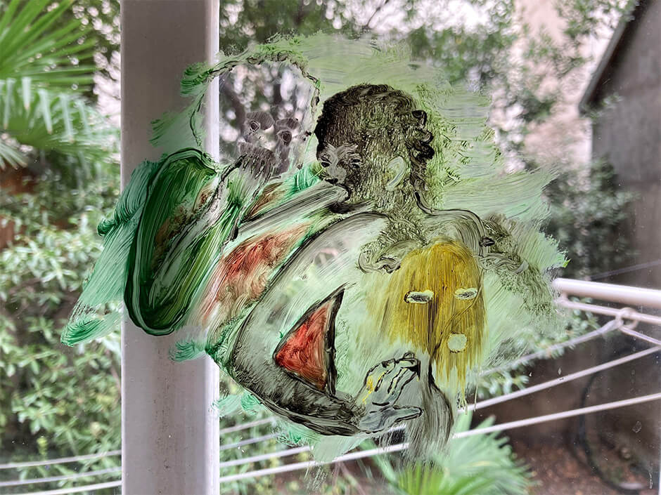 彼女の制作の起点となるのは、画家自身の身体。 半透明のアクリル板やキャンバスを支持体に描かれる作品からは、人間の暗部だけではなく、時としてユーモアや救いを感じさせる物語が立ち現れる。