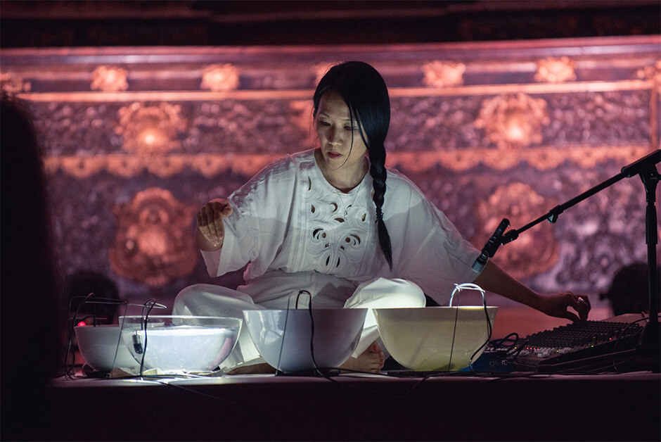 水という素材の流動性を生かした電子音響楽器「Waterbowls」を考案し、実験音楽の分野でパフォーマンスや録音作品、インスタレーション、映像作品等を発表するTomoko Sauvage。器の椀、石、貝、ガラス、また水滴や水波、泡など多様な形態の水を組み合わせた独自の音具を調律・振動させ、通常は聞こえないに等しい微細な音をマイクで拡大し音風景を構成する。