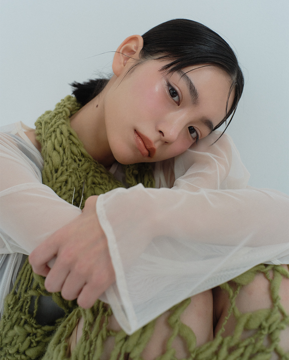 MONO LOOK EYES L-103 limited color ¥4,290, MONO LOOK EYES e MS-01 ¥4,290, COMPLEXION FACE COLOR 01 ¥4,950, VELVET FIT LIPSTICK 11 ¥5,830(Refill and Case)by SUQQUknit top ¥19,800 and cardigan around the waist ¥22,000 by NKNIT, skirt ¥96,800 by HARUNOBUMURATA THE WALL SHOWROOM, shoes ¥70,400 by REPETTO LOOK.INC BOUTIQUE DIVISION, each shirt and tights stylist’s own