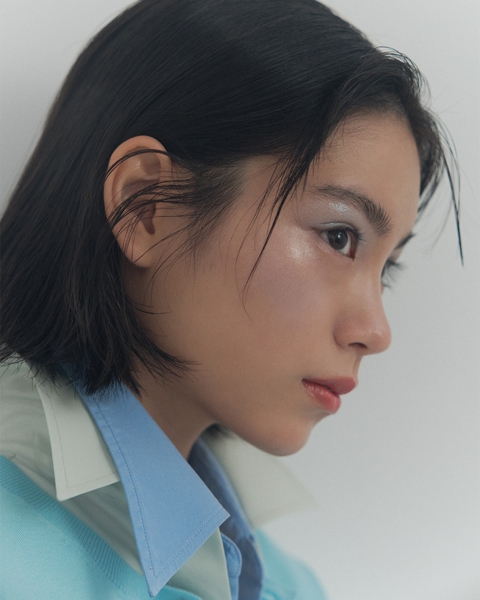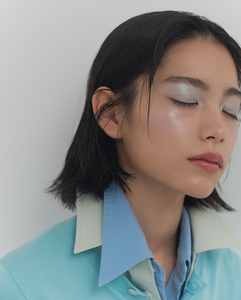MONO LOOK EYES e MS-03 ¥4,290, COMPLEXION FACE COLOR 02, 03 ¥4,950, VELVET FIT LIPSTICK 12 ¥5,830(Refill and Case)by SUQQUdress ¥275,000 by KAKAN, shirt ¥26,400 by SIMONE WILD FILG SHOWROOM, brooch ¥48,400 by SISI JOIA FILG SHOWROOM, top stylist’s own