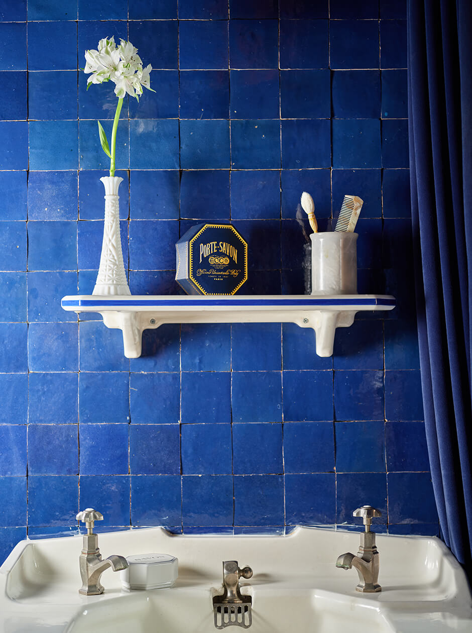蓋と水切り器からなるコンパクトなフォルムは、洗面台にすっきりと収まり、ネイビーと白の調和が古き良きバスルームへのオマージュを感じさせる。