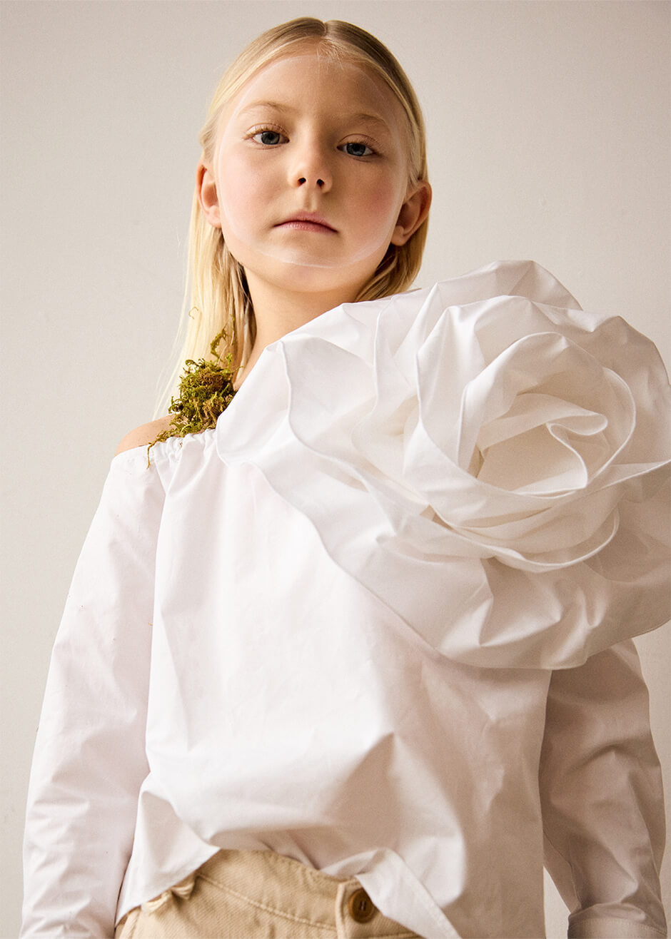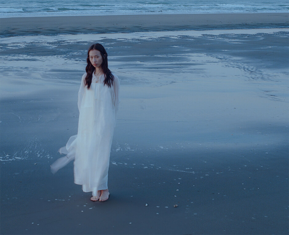 その風景をもとに衣装を制作し、水面に映る空の色や風に揺れる景色、野花の気配を、詩的でロマンティックなスタイリングで表現している。