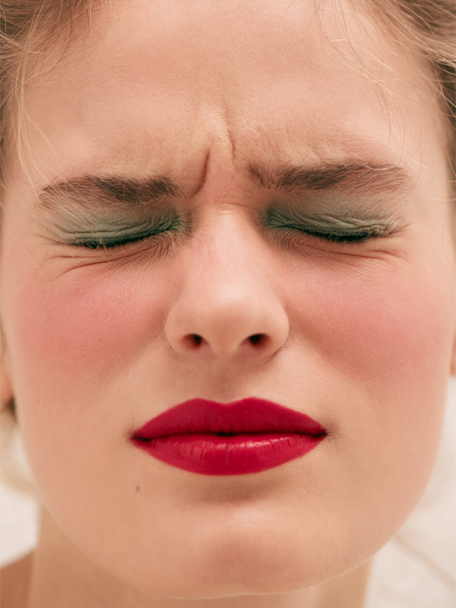 The subject shifts between control and discomfort, softness and tension, suggesting femininity not as a stable identity but as something learned, adjusted and continuously constructed.