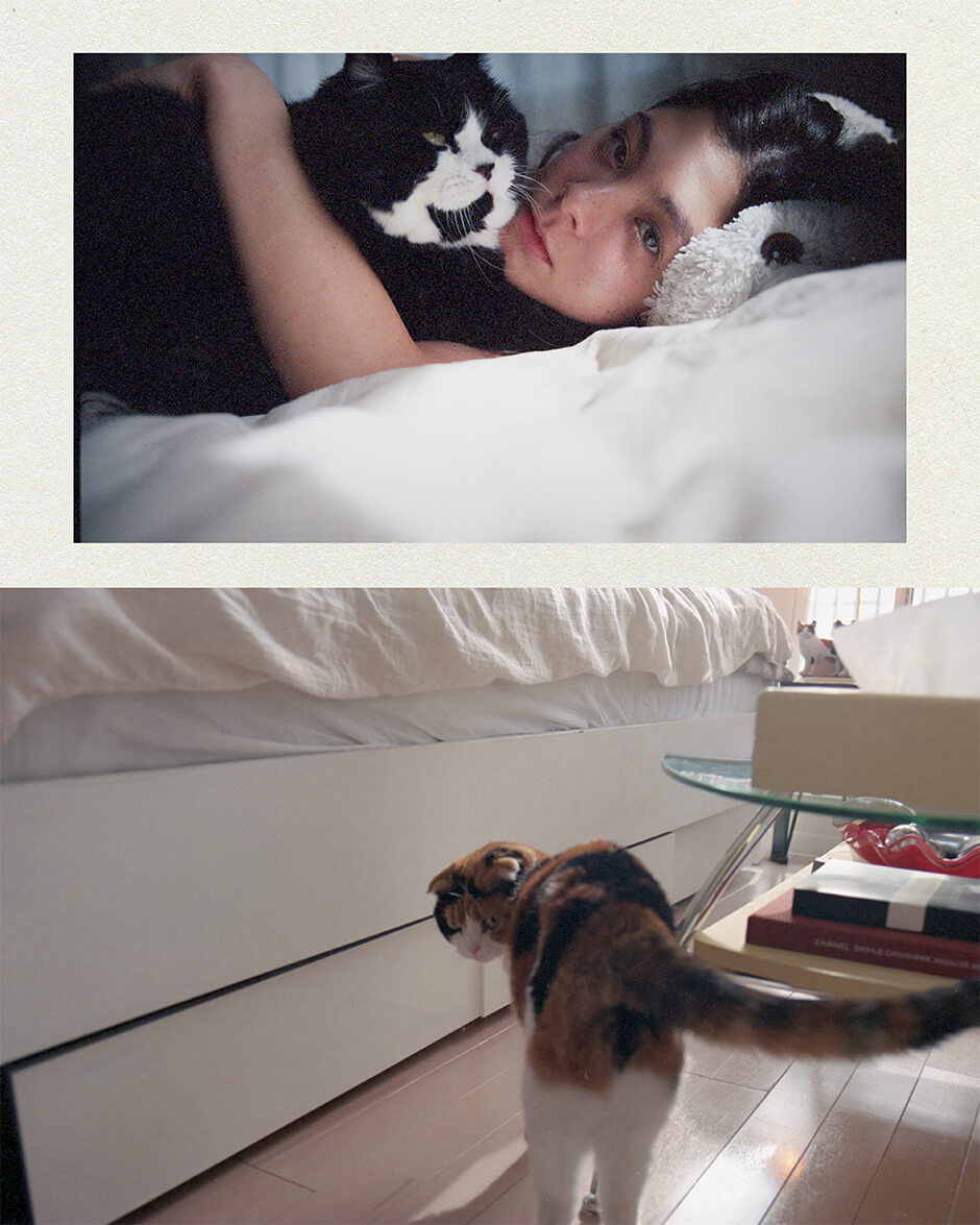 被写体と2匹の猫の間に流れる優しい時間を、静かにすくい取ったファッションストーリー。