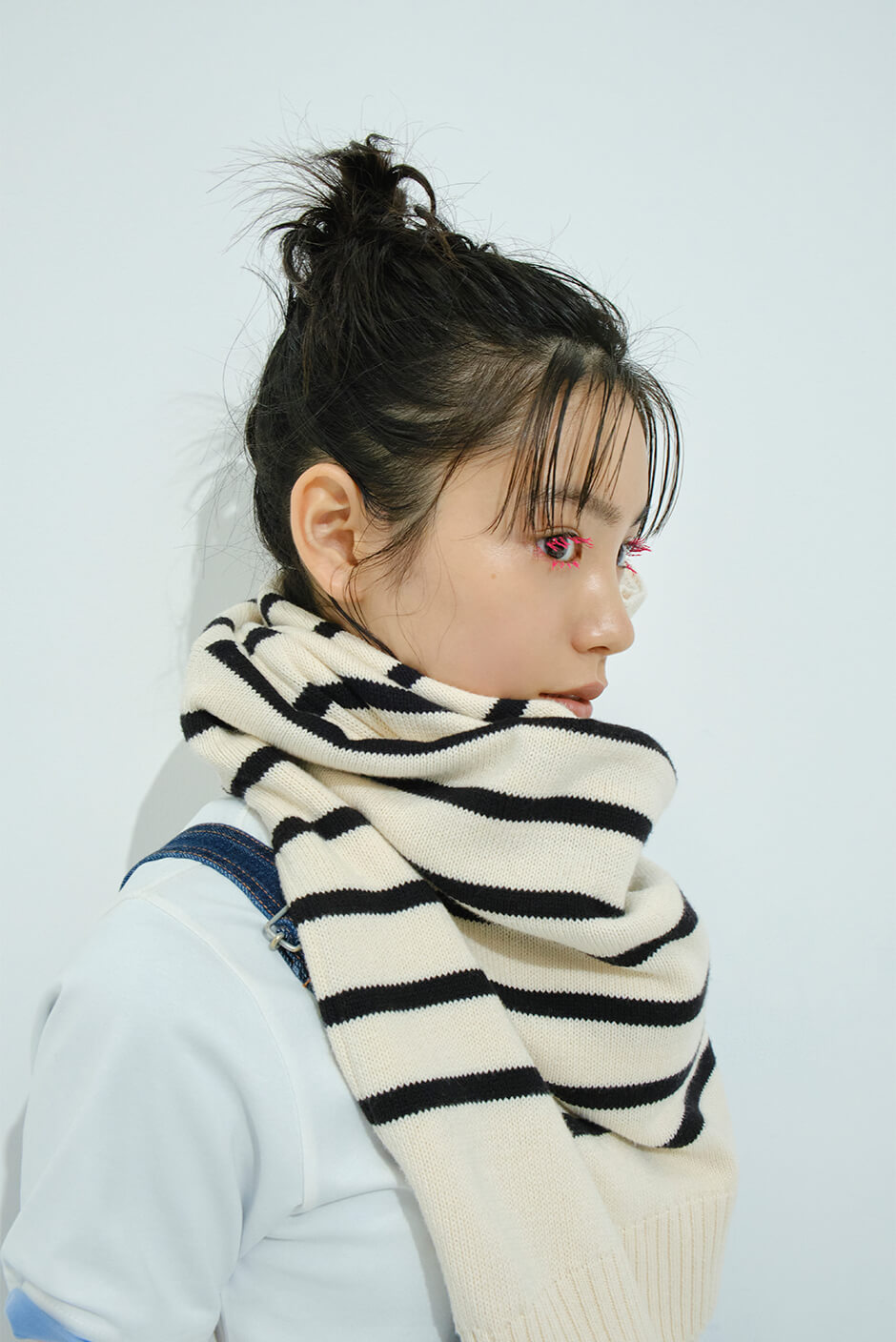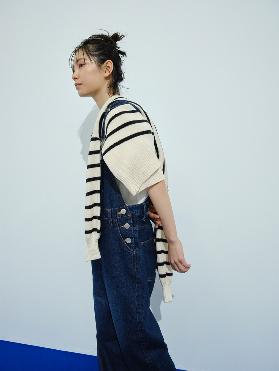 1回目は、デニムアイテムと「TO B. BY AGNES B.」のアイコニックなボーダーのリズムが響き合うスタイリング。