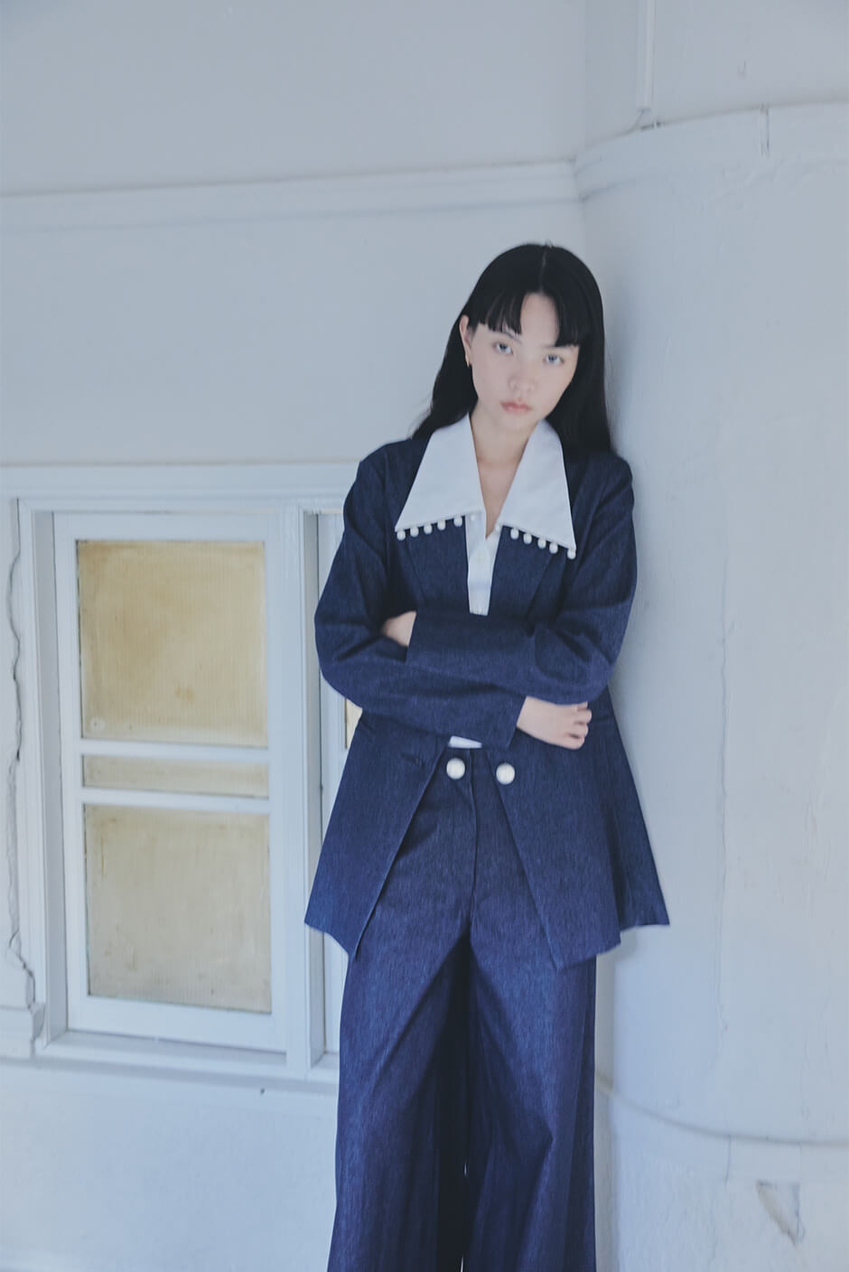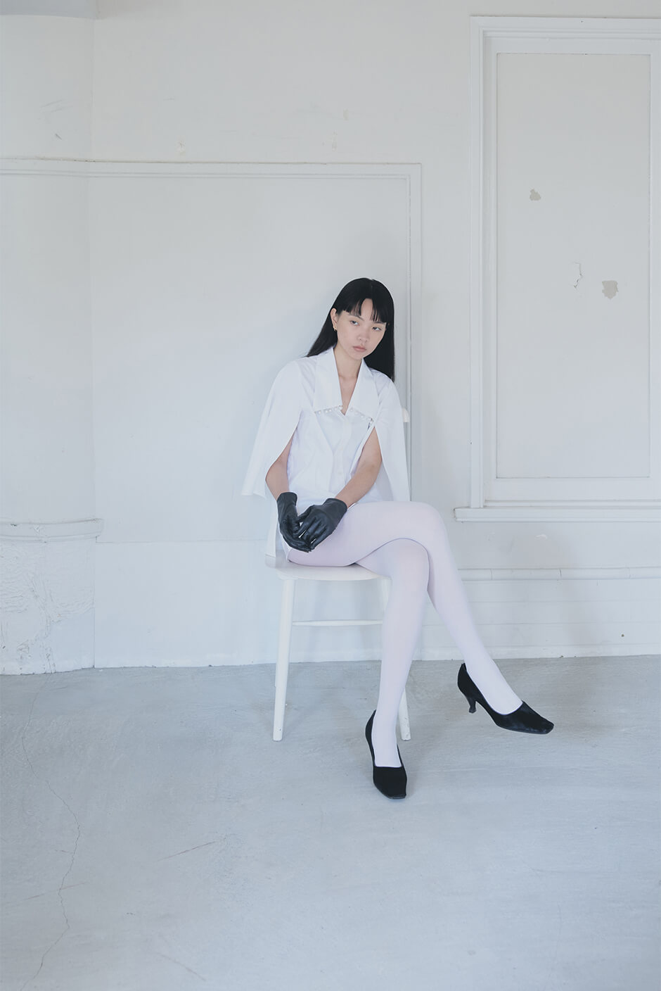 さらにキーとなるのは、テーラードシャツをベースにケープのようなシルエットへ再構築したトップス。