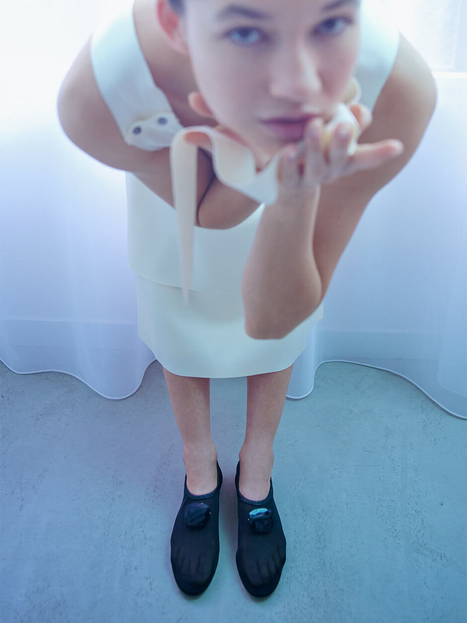 インテリアデザイナー 倉俣史朗の名作「Miss Blanche」にインスパイアされ、一瞬の美しさと永遠性、儚さの奥に秘められた強さを、シューズのデザインとして表現した。