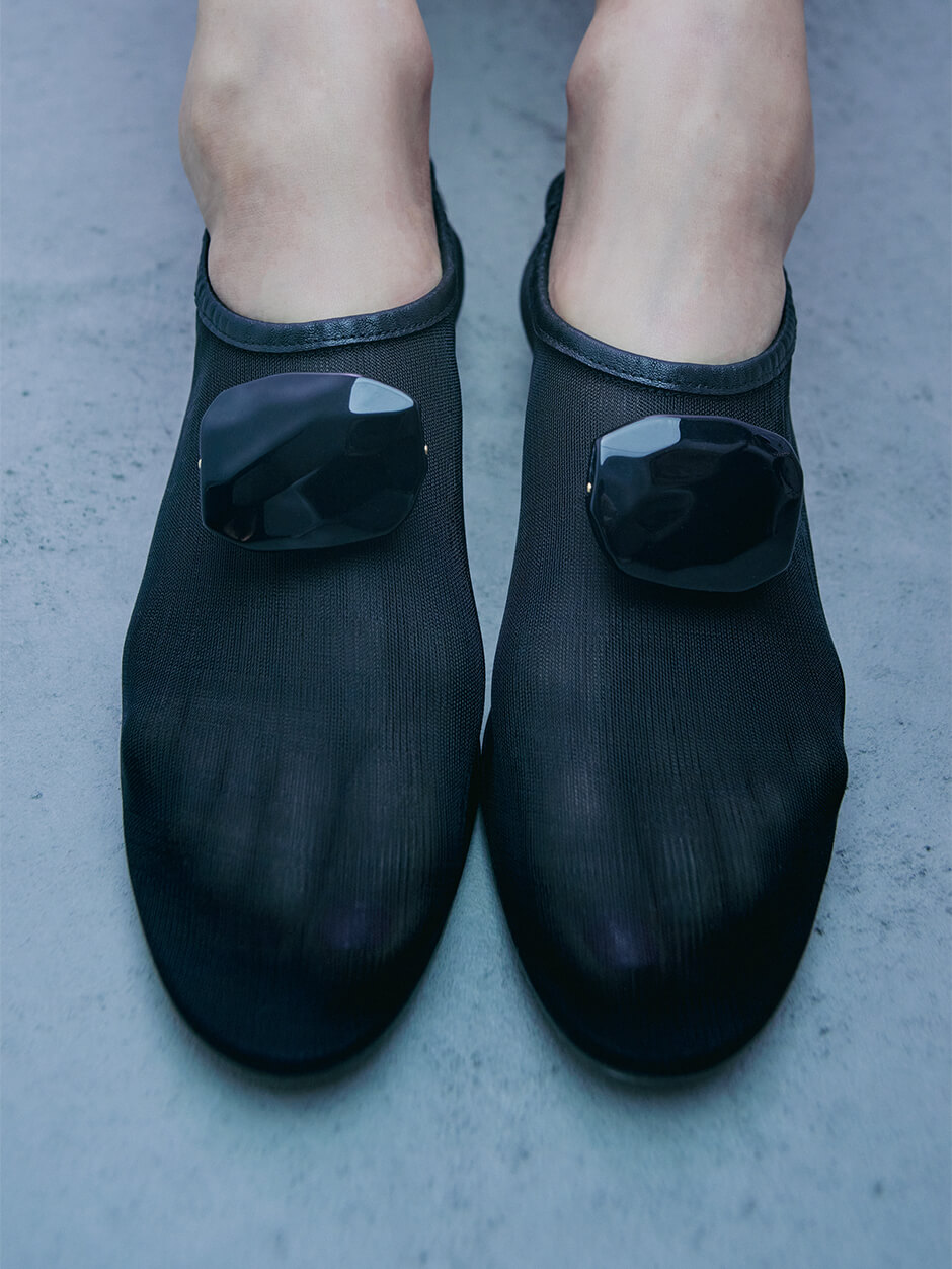 足元にさりげない詩情を添えるメッシュや花柄ファブリック、そして今季新たに加わったストーンシリーズ。
