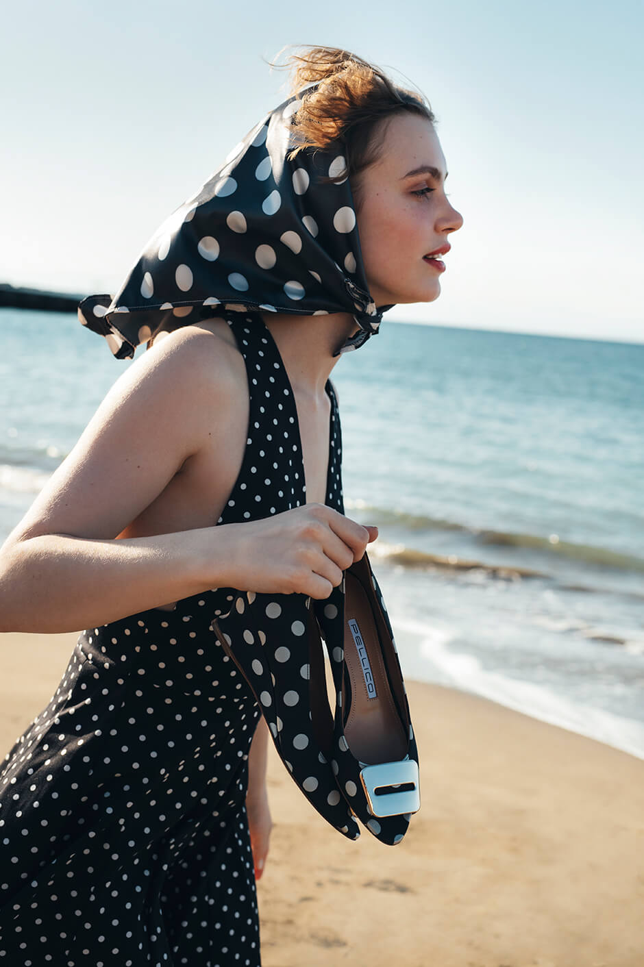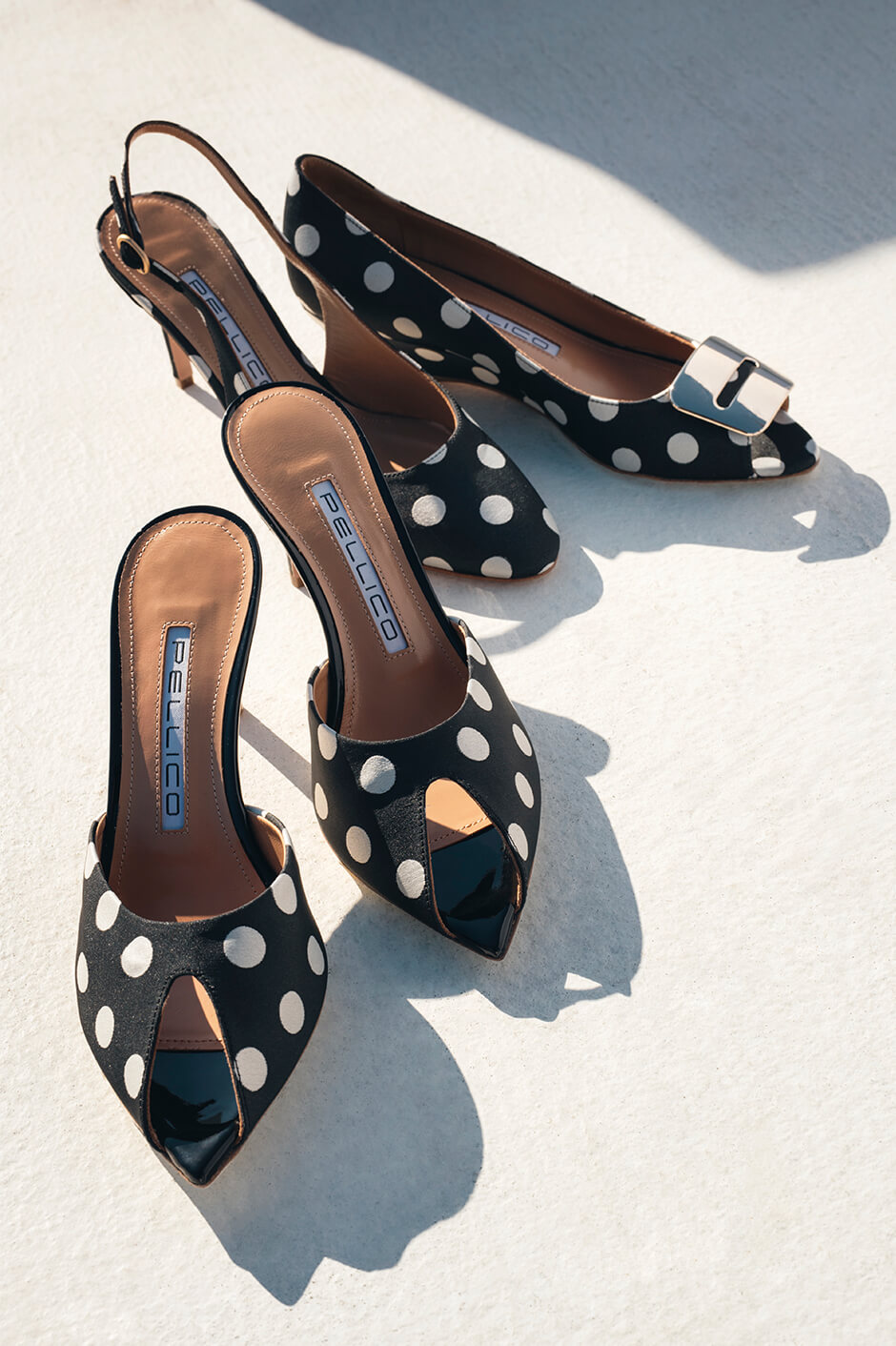 クラシックなブラックに白いドットをリズミカルに配した、今コレクションを象徴する「Ischia Dot」。