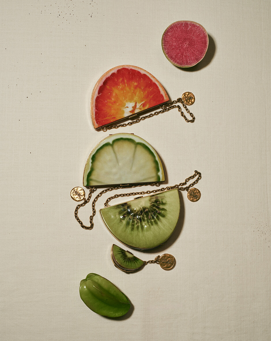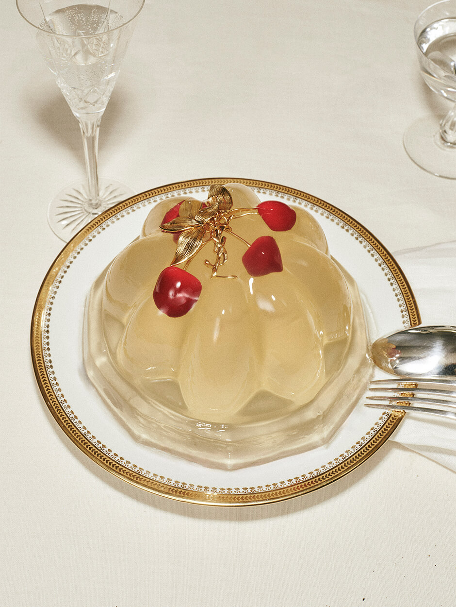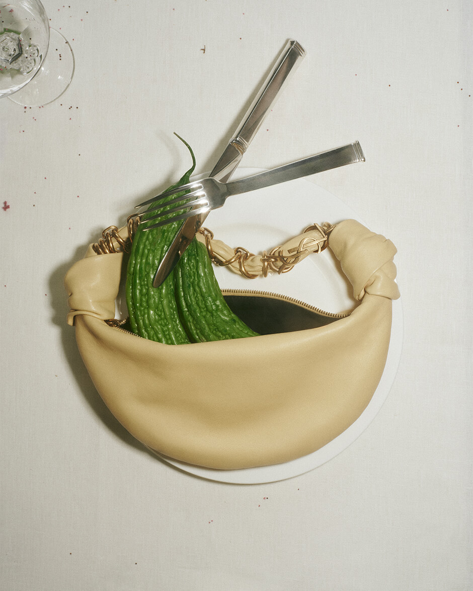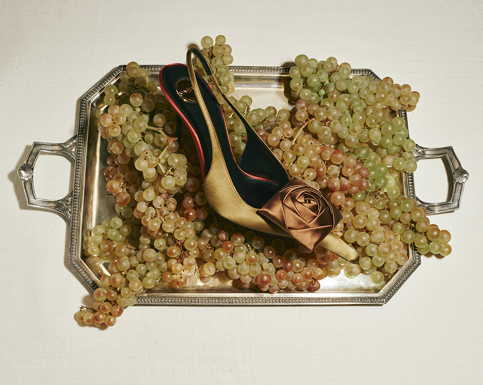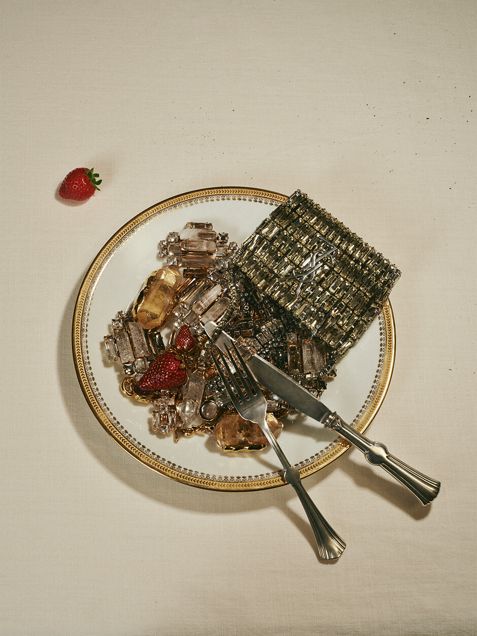 銀のトレーに置かれたシューズや造形が際立つバッグは、夜の空気を想起させ、灯りが落ちた後の緊張感を映し出す。