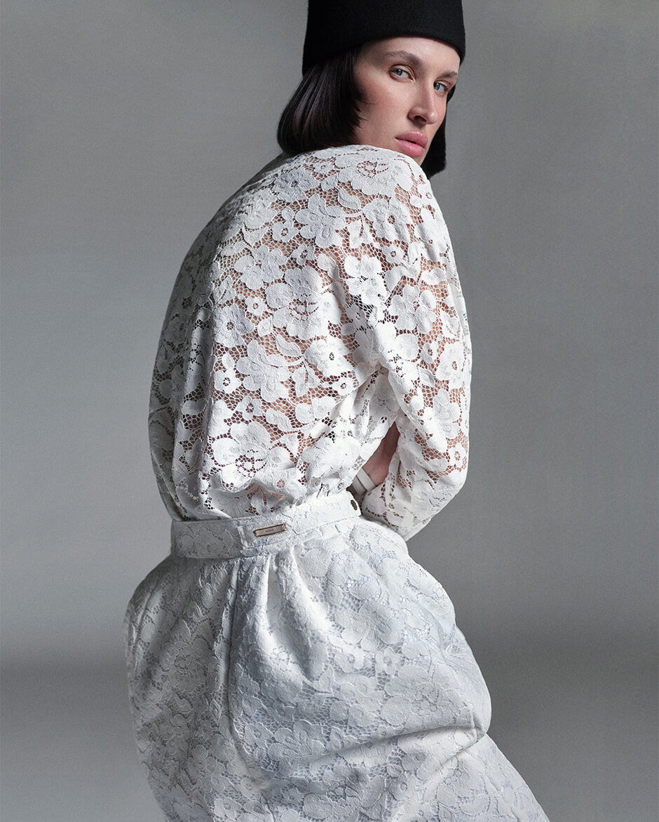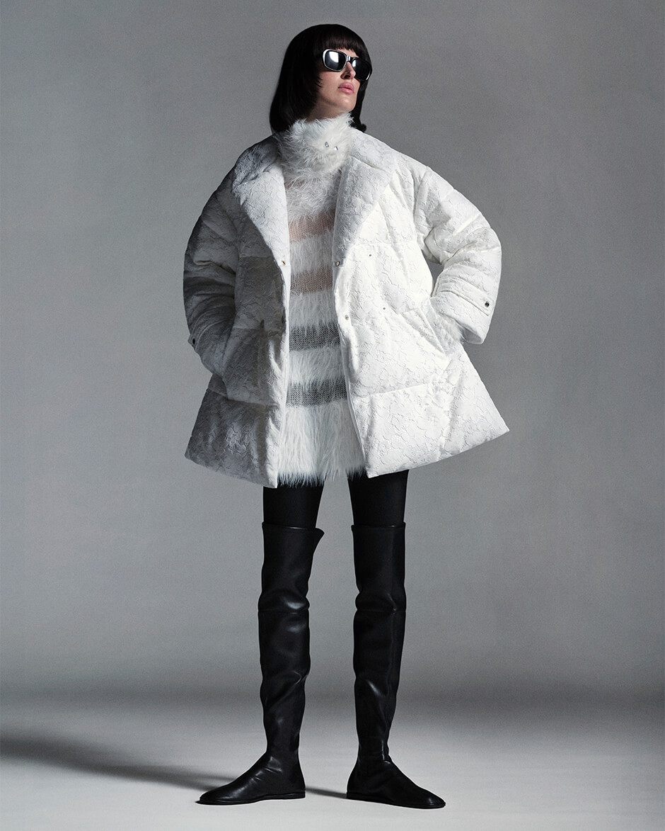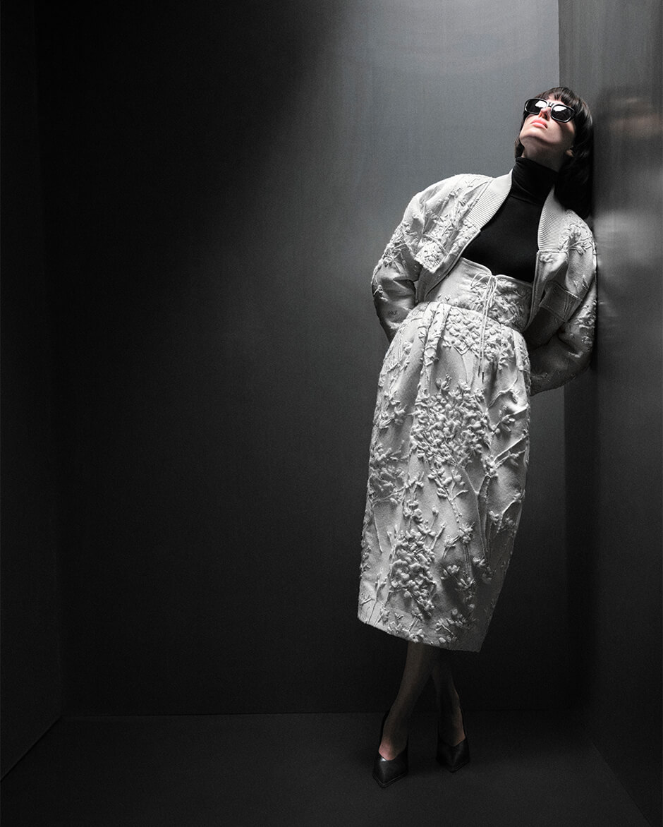 起毛感のあるレース素材や、数種の糸に繊細なスパンコール糸を織り込んだウールツイード、シルバーとホワイトのジャカード生地など、上質なマテリアルが日常に寄り添いながら内なる美しさを引き立てる。