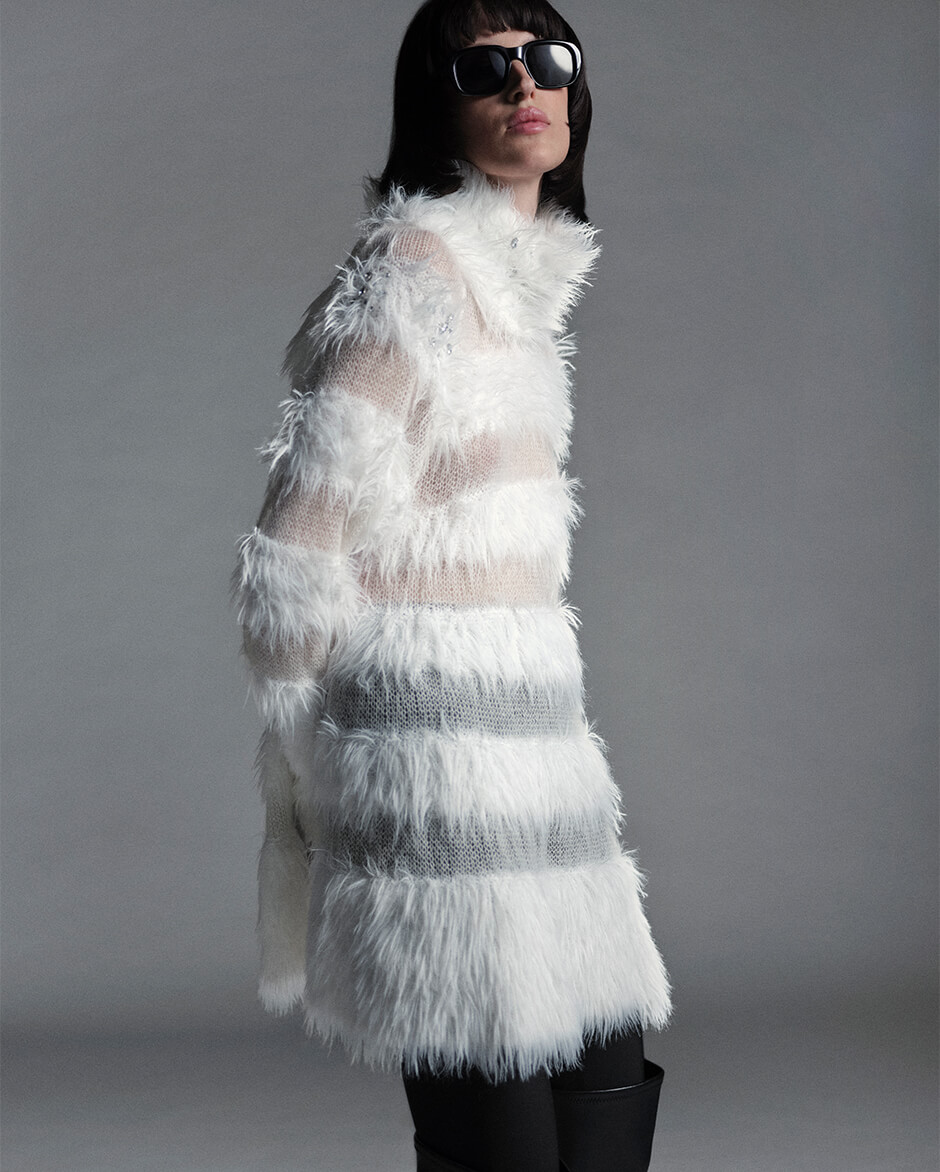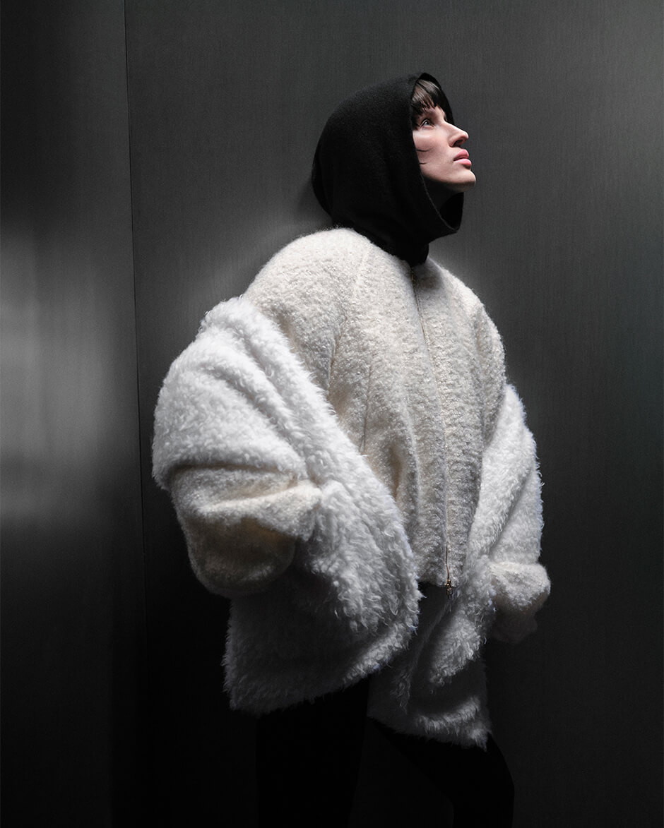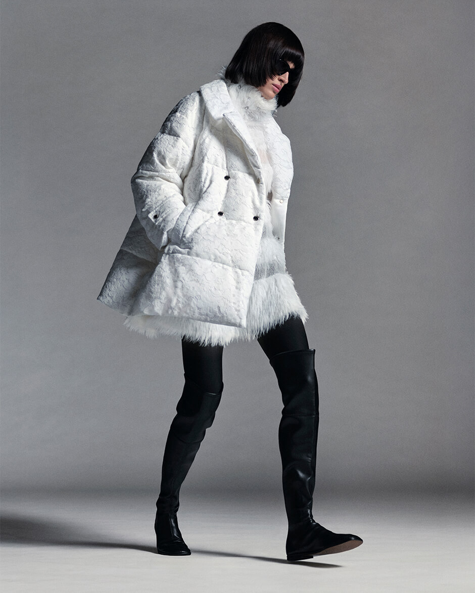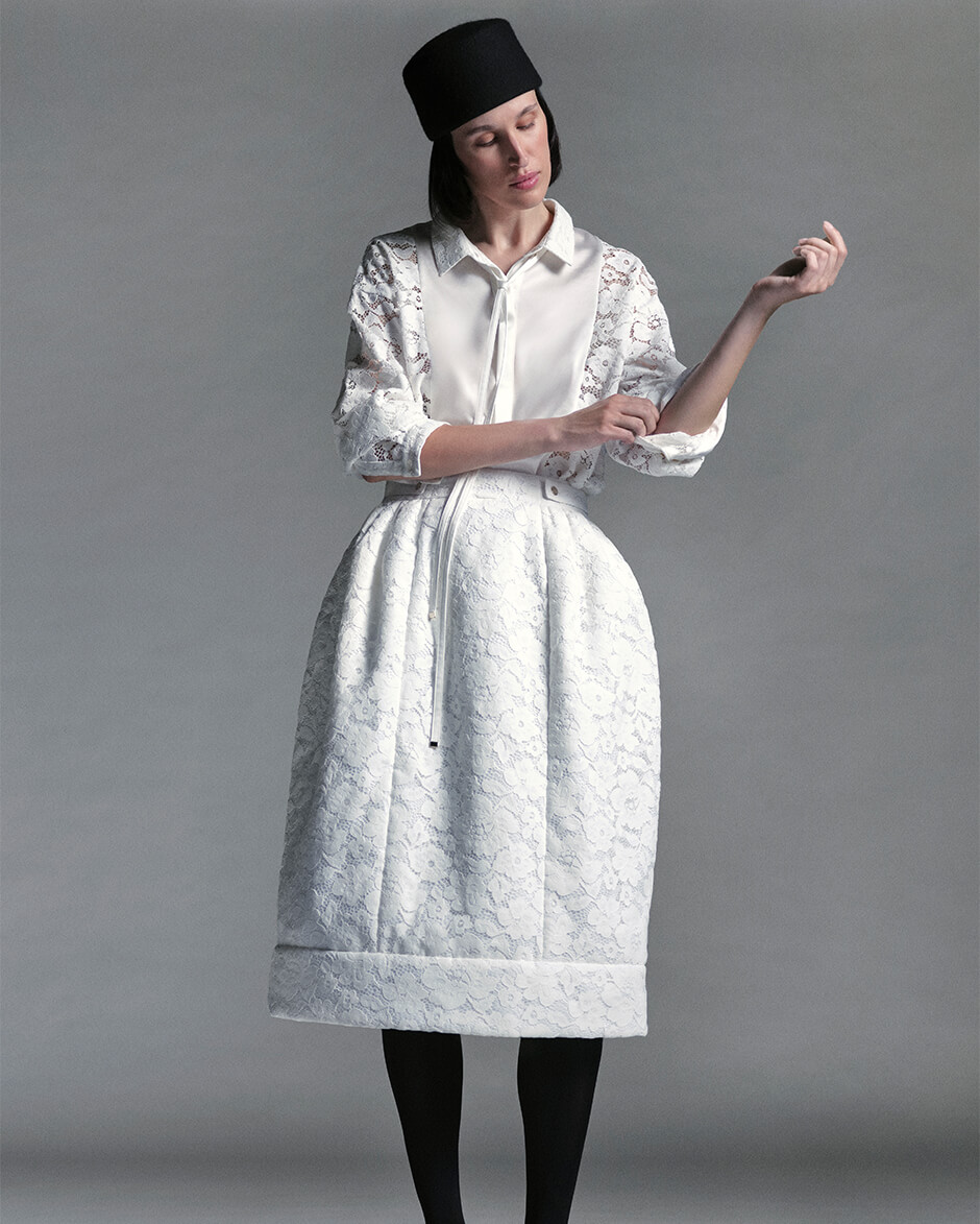 起毛感のあるレース素材や、数種の糸に繊細なスパンコール糸を織り込んだウールツイード、シルバーとホワイトのジャカード生地など、上質なマテリアルが日常に寄り添いながら内なる美しさを引き立てる。